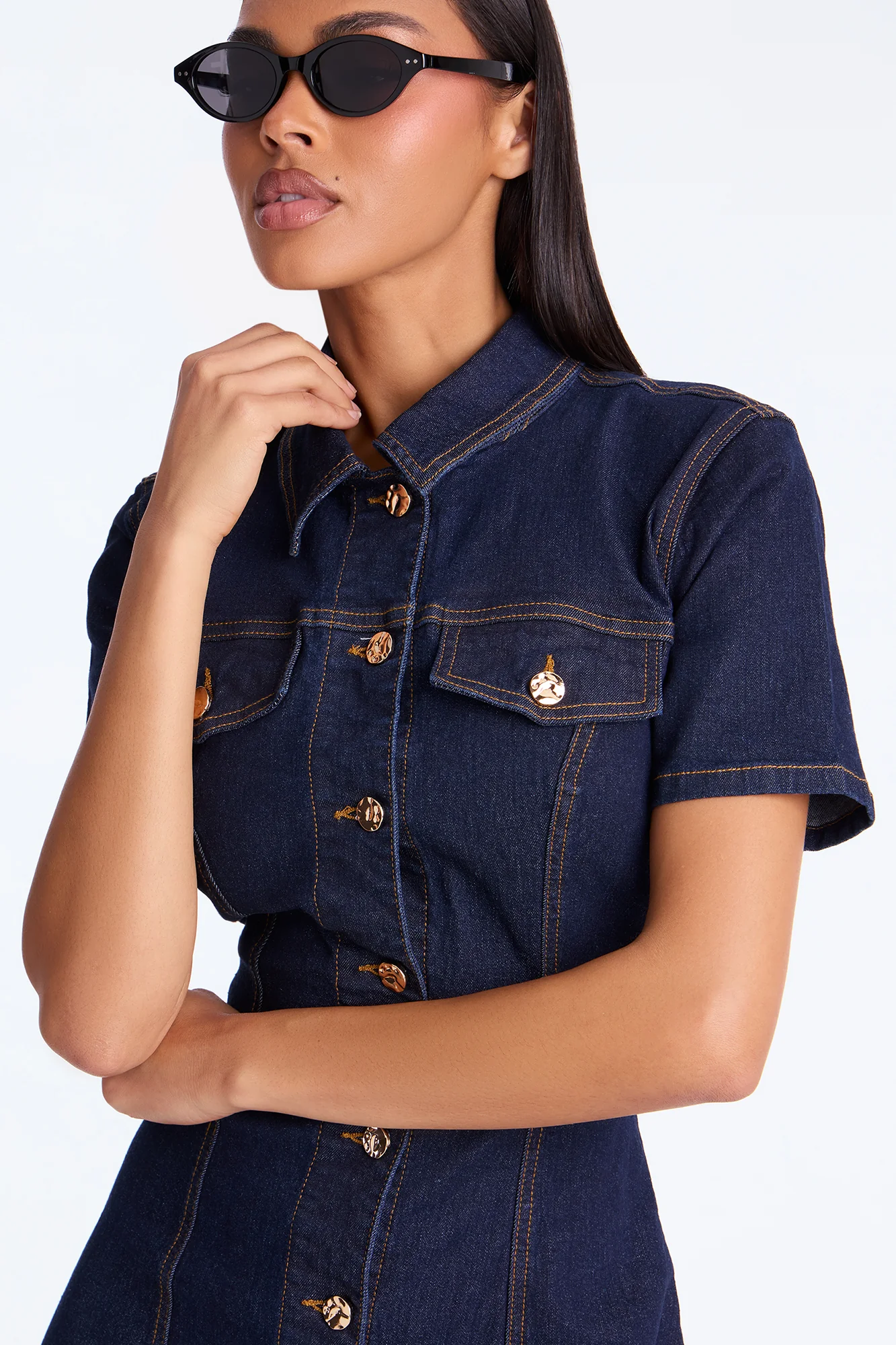 Deandra Denim Stretch Short Sleeve Midi Dress - Dark Denim
