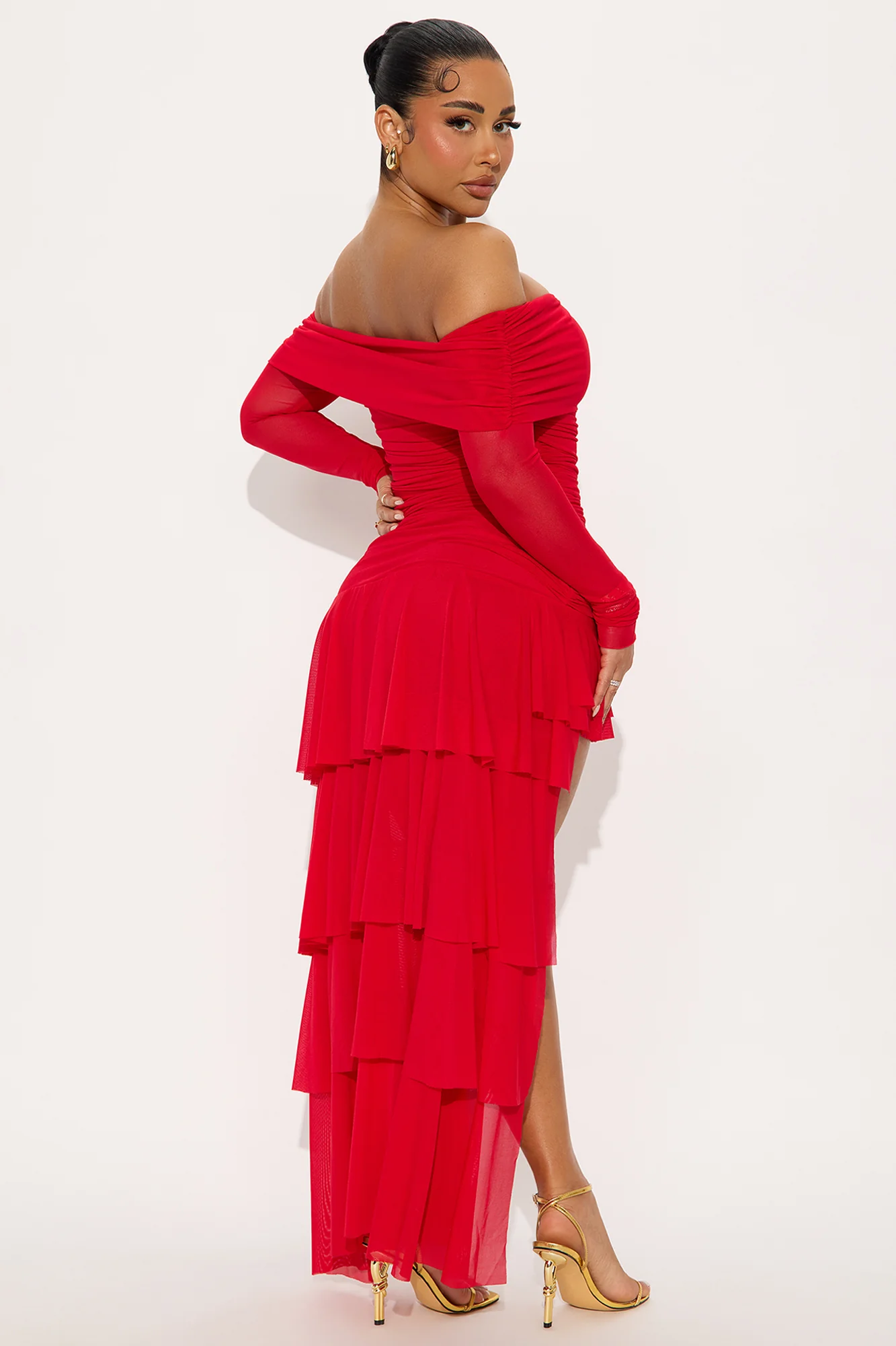 Naya Ruffle Asymmetrical Mesh Mini Dress - Red